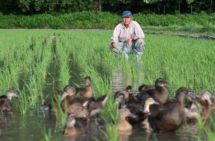 アイガモ農法とは農薬を使用する代わりに、水田にアイガモを放して雑草取りや害虫退治をさせる、人と自然にやさしい農法のことです。 アイガモたちは自分のエサとして雑草や害虫を食べてくれる上、水田の土や水をかき回して酸素を補給し、おまけに稲の養分となる糞まで撒いてくれます。1990年ごろに福岡県の古野隆雄さんが確立したアイガモ水稲同時作は国外にも広がっています。
